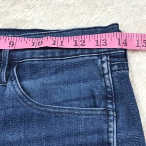Constructed from a cotton blend fabric these straight leg jeans feature a high rise slim silhouette with a double needle side seam and silver hardware and a full length inseam.