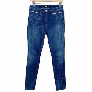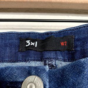 3x1 W2 Dark Wash Raw Hem Moto Zipper Jeans. These contouring and shaping fit jeans have horizontal zipper detailing at hips. Raw hemline which may have been done by previous owner as there is an opening at seam as shown. Cotton/Lycra/PES blend. Made in the USA. Factory distressing to denim. *AI model depiction of style.