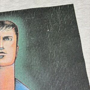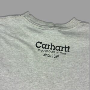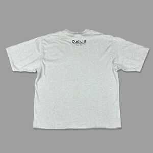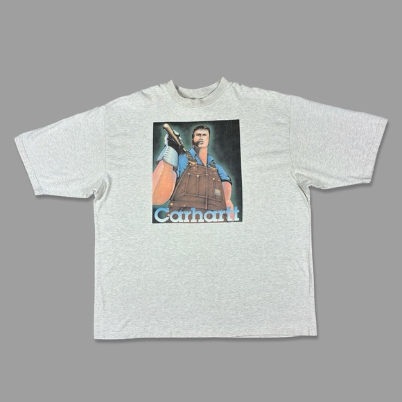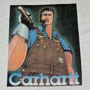 Vintage Carhartt T-Shirt - It has some light staining and discoloration around the neck and underarm area. It has been through an oxy soak. There is overall fading in color from wash & wear and some cracking in the graphic