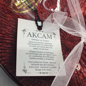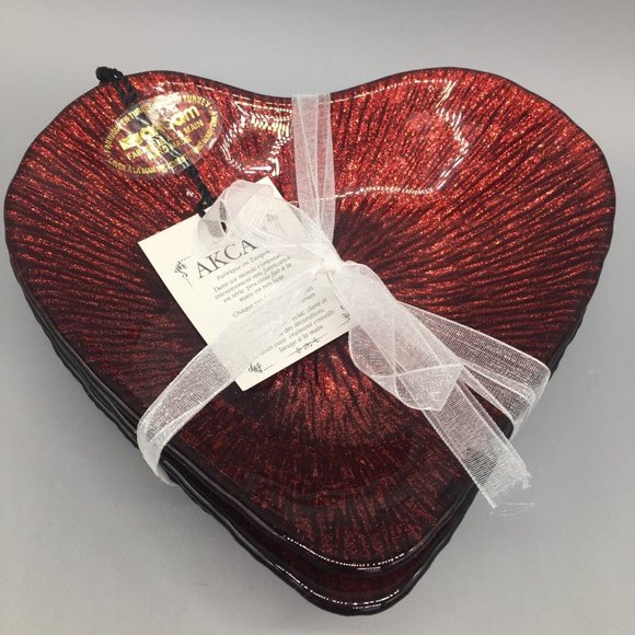 4 Akcam Red Glass Heart Appetizer Dessert Plate Dish Set Valentine Love Shimmer