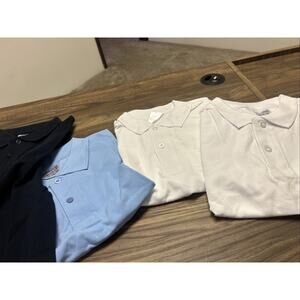 The product is a set of four Andrew Scott School Uniform Polo shirts for boys in size XL 12-13. These solid color polo shirts feature short sleeves, a button closure, and are made from a comfortable cotton blend fabric. The set includes two white, one navy, and one blue shirts, all suitable for any season. Each shirt is designed for a regular fit, ensuring comfort and breathability for school activities. Perfect for school uniforms, these shirts are machine washable for easy care and maintenance.