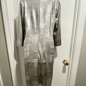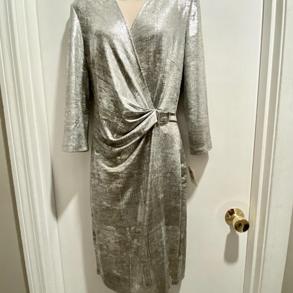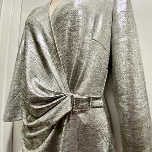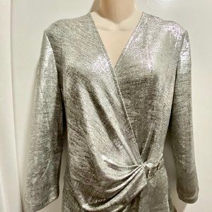 Up for sale is this stunning wardrobe must quiet Luxury retro 20s minimalist Anne Klein Christmas Holiday Metallic Silver Drape Waist Faux Wrap Midi Holiday Special Occasion Dress with a waist drape and crystal belt. New with tag condition, retail - $119. Size 10, let me know if you need measurements. Check my other dresses.