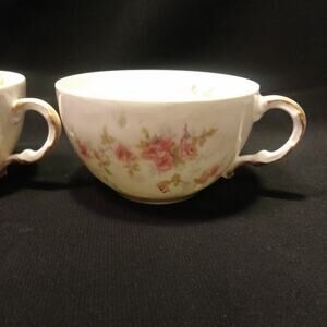 antique porcelain tea cup in a transfer printed pink roses pattern against a white background. The handle has delicate hand gilding.
