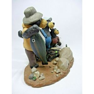 4 Bear Buddies Group Catch Fishing Stoneware Figurine Fish Basket Fisherman