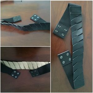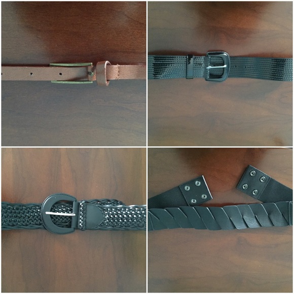 Four fashion belts to be worn around the waist. Skinny brown belt; shiny black belt; black woven belt; and twisted black belt with snap closure.