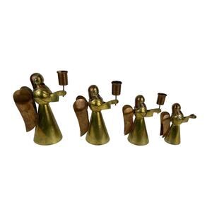 4 Brass and Copper Primitive Angels Candle Holders Hand Made Vintage