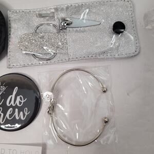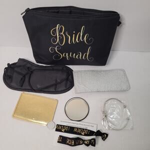This is a collection of items themed for a bridal party, likely intended as gifts or accessories for a "Bride Squad."
