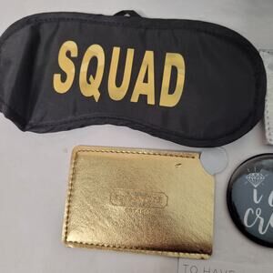 A black eye mask or sleep mask with "SQUAD" in gold lettering.