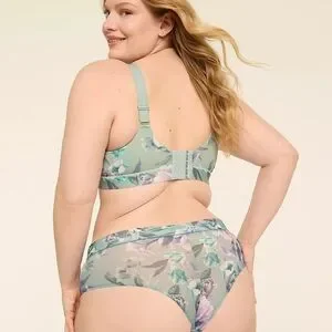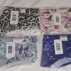 Set of four Cacique panties with diverse prints. Features leopard, pink floral, purple floral, and blue floral designs.