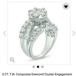 Symbolic of passion as a Romantic Choice, This ring is an Elegant Design. 7 Magnificent Diamonds form a brilliant flower at the center of the engagement ring. The arrangement stands tall a top a band set with elegant baguette-cut diamonds. The ring is finished with borders of shimmering round accent diamonds that flank the style top and bottom . Engagement was called off so my loss may be your gain. Pictures do not do justice. Go to Zales website and read actual reviews. Item# 18990556