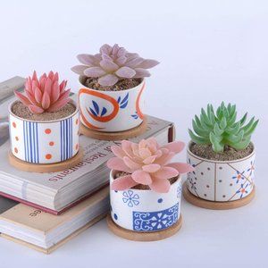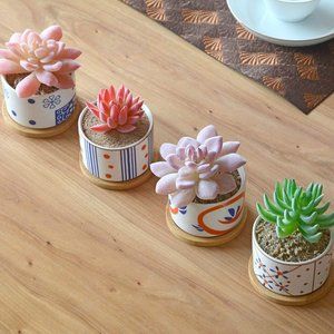 4 Ceramic Planters for Cactus Succulent with Drainage Hole & Bamboo Saucers 3"