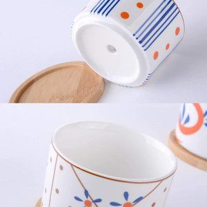 Collection Set of 4 Pots: with assorted colorful patterns. Planter Size: 3x3x2.17 Inches (L*W*H); bamboo Tray/Saucer Size: 3.1x3.1 Inches (L*W).