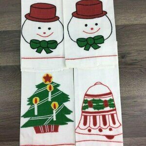 4 Christmas Kitchen Towels Snowman Tree Bells Ramie Cotton