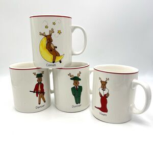 4 Christmas REINDEER MUGS Whimsical Holiday Cups LTD Commodities White Ceramic