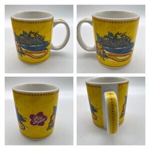 Set of 4 Collectible Hilo Hattie Souvenir Mugs, Coffee Cups, with Hawaiian tropical design. The design on the mug has hibiscus flower, Volcano and lei with Hilo Hattie logo.