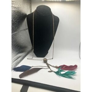 4 Colored Feathers with Metal Ball & Leaves Chain 34" Necklace!