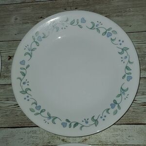 Periwinkle-blue blossoms and hearts embellish these 7" bread plates with petal-soft color & lacy vines.