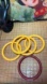 Bracelets are in excellent vintage condition. They look 70s 80s but could also be earlier midcentury pieces. Yellow one are slightly marbled and have a little dot on one side. The surface is smooth with a few imperfections due to manufacturing processes. I believe they are acrylic. They have a higher pitch clinking sound when they tap together. Carnelian color bangle is a different material, possibly a plastic resin. Size of 8” L and they measure about 3.25”W and have a 3/8” thick band. You can wear one or all and mix them up in whatever order you want.