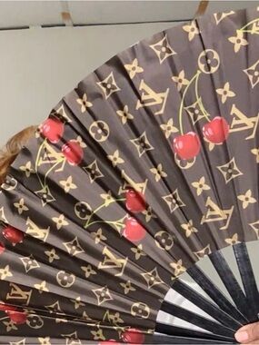 Brown and tan , flowers, Pink and Cherries. Lightweight and portable. Stylish two-tone edge trim. Very pretty.