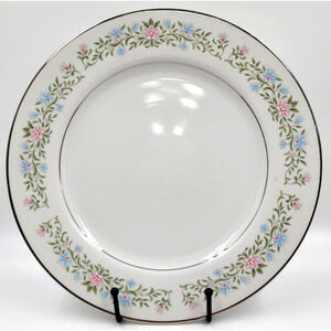The Eileen 10 1/4” Dinner Plate with a Cotillion Floral Silver Trim Pattern is a vintage piece from the Mid-Century Modern era, featuring a round shape and off-white color with a glossy finish. Made of porcelain and china, this original dinner plate with a floral theme was manufactured in Japan by International. It weighs 1 lb. 6 oz. and has a printed backstamp.