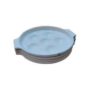 Add a touch of elegance to your dining table with these Escargot White Enamel Metal Plates. The set includes four round baking dishes, with handles, each with a diameter of 6.25". The dishes are perfect for baking snails, mushrooms, and other small dishes in any oven, be it pizza, steam, electric, or gas.