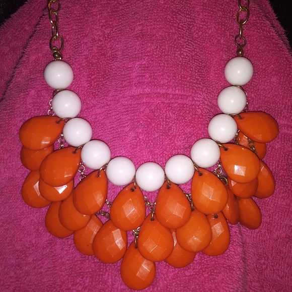 Turn heads with this cascading beaded necklace that features white round beads & orange teardrop shaped beads! (Slight signs of aging in clamp)