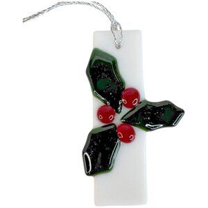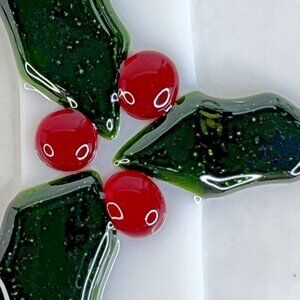 4 Fused Stained Glass Holly Berry Christmas Ornaments Set Red Green White