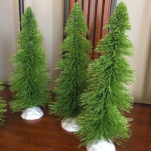 4 Green Glitter Tabletop Decor Bottle Brush Christmas Trees Snow Base 9" x 4"