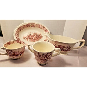 This is 4 vintage Homer Laughlin Historical America Lincoln's Gettysburg Address Serving Bowl/Gravy Boat, open sugar and coffee cup madein the United States in 1863. The set includes a serving bowl, gravy boat, open sugar, and cup, all featuring a multicolor Lincoln pattern. This original production set from Art Pottery has a glossy finish and is suitable for all occasions.Please look at all the photos as they are part of the description. Please email with any questions.