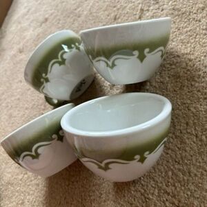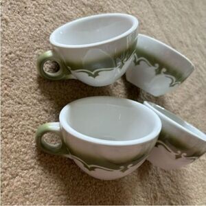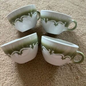 4 Jackson China Vintage Green & White Coffee Cups. Cups are 2 1/2” tall, 3 3/4” wide at top. They are in great condition, not much wear, a few small chips at the very bottom. See photos.