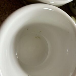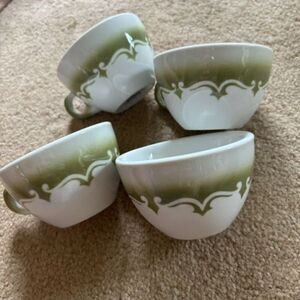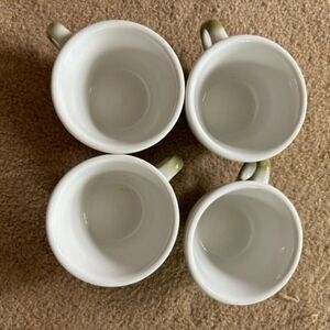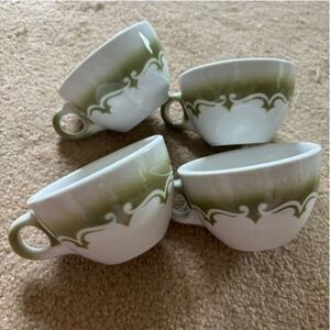 4 Jackson China Vintage Green & White Coffee Cups. Cups are 2 1/2” tall, 3 3/4” wide at top. They are in great condition, not much wear, a few small chips at the very bottom. See photos.