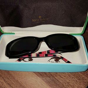 PLEASE LOOK AT ALL PICTURES. AUTHENTIC KATE SPADE SUNGLASSES. THESE ARE ADJUSTED TO FIT ME BUT CAN BE EASILY ADJUSTED TO FIT YOU. COMES WITH KATE SPADE BOX AND KATE SPADE CLOTH TO CLEAN GLASSES. HAVE BEEN WORN. OPEN TO REASONABLE OFFERS AND BUNDLE DISCOUNTS JUST ASK. PLEASE ASK QUESTIONS BEFORE BUYING. SUPER CUTE. THANK YOU FOR LOOKING.