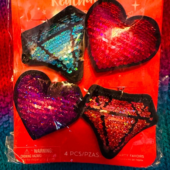 Four [different colors] Keychains or ornamentals for many things. New in sealed package. No tags. Just sealed. All four different colors. Silver colored chains with large crabclaw hooks.