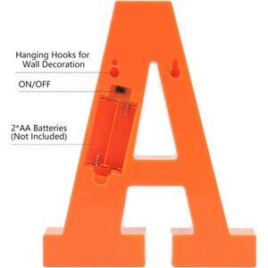 Light Up Letters are made from high-quality plastics .Size approx (D x W x H ) "6.3" x 1.5" x 8.5", Requires 2 AA batteries(not included).