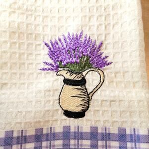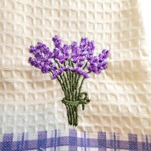 Set of 4 embroidered kitchen towels from Lavien with lavender themed designs. Waffle weave texture with purple plaid trim. Approx. 16"x24". Cotton blend made in Turkey. Machine washable.