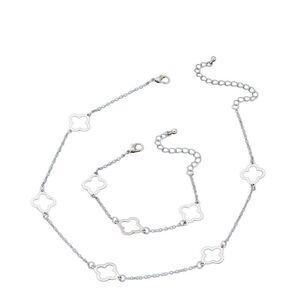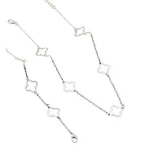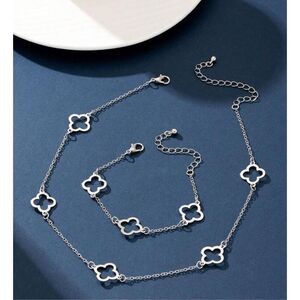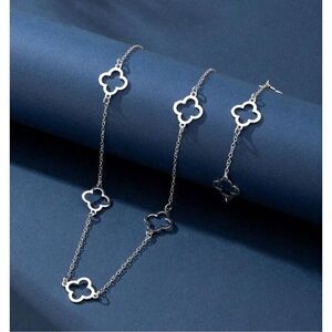 Beautiful silver 4 leaf clover bracelet and necklace set in stainless steal that will last a long time without tarnishing. Good style and good luck, you can’t get much better than that.