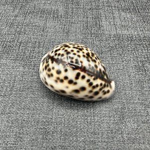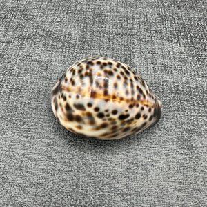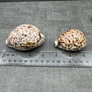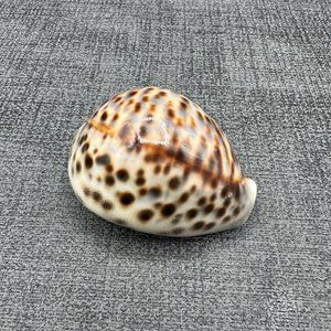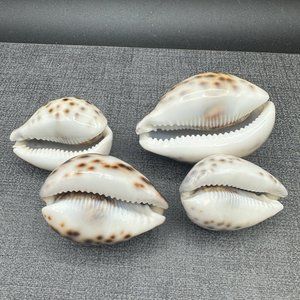 Beautiful, seashell with cream / dark spots and dorsal line. Large Tiger Cowrie (Cypraea Tigris) size range: about 3 " to 2.25" Great for Beach Themed Decor, Aquarium and Terrarium Decoration and Jewelry Making. You will receive 4 varied sizes, all beautiful. Please see photos for condition--may have minor imperfections.