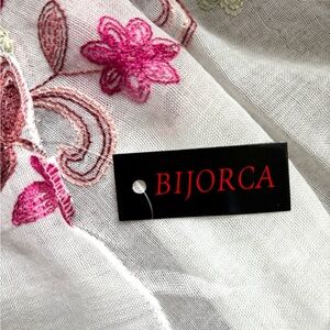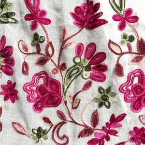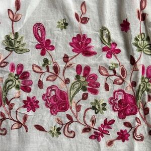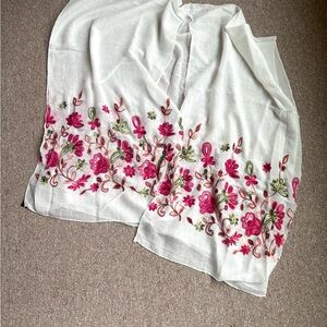 These are 4 matching white shawls with vibrant pink and green floral embroidery. Perfect for bridesmaids at a summer wedding, they are brand new and in perfect condition, Made of cotton and they are 36in. Across, including the sleeve area , so they would drape around your arm, and about 30in. Long, she let her bridesmaids pick the dress that flattered them most and then she gave them matching shawls , she knew the photos against the privet hedge would be stunning.