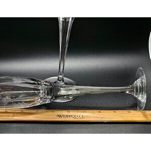 This set of elegant Mikasa Bacchus crystal champagne flutes, 10-3/4 inches tall, features an intricate etched grapevine design, ideal for formal occasions or refined dining.
