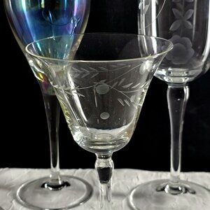 This collection of vintage goblets features elegant etched designs and an iridescent finish on one. A charming mismatch for collectors or cool barware displays.