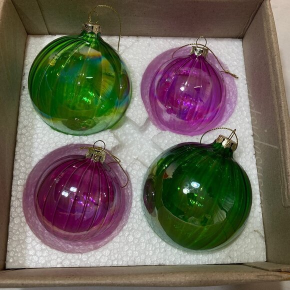 4 NIB Fluted Glass Y2K Globe Holiday Ornaments Purple & Green