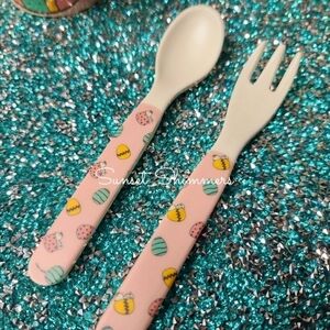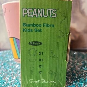 These are soooo cute!! Here we have a New in box Peanuts, kids size Snoopy & Woodstock Spring/Easter, place setting. The set include (1) plate, (1) bowl, (1) cup, a fork and a spoon. These are all made of Bamboo fibre, and are biodegradable and Eco-friendly. Soooooo cute!!
