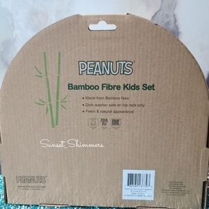 These are soooo cute!! Here we have a New in box Peanuts, kids size Snoopy & Woodstock Spring/Easter, place setting. The set include (1) plate, (1) bowl, (1) cup, a fork and a spoon. These are all made of Bamboo fibre, and are biodegradable and Eco-friendly. Soooooo cute!!
