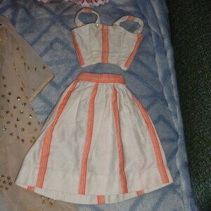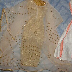 RED PLEATHER FORMAL COUNTRY GOWN,FABULOUS FORMAL GOLD SEXY DRESS WITH ATTACHED CHIFFON OVERLAY,RED CHECK DRESS WITH FLARED PLEATED SKIRT AND ONE OF A KIND HAND MADE WHITE/TAN SUMMER 2 PIECE TOP WITH MATCHING SKIRT.