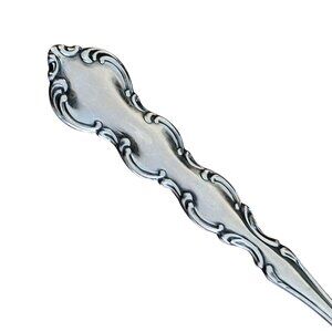 Elegant vintage Oneida Deluxe Mozart silverware with scalloped edges and baroque scroll design. Crafted from durable stainless steel, perfect for enhancing your table settings.