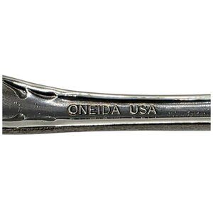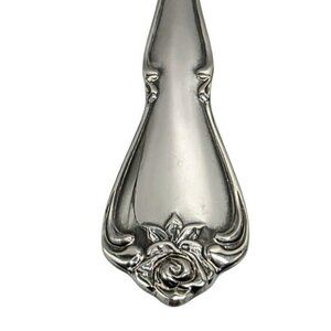 The product is a set of 4 vintage stainless steel teaspoons from the True Rose/Arbor Rose pattern by Oneida. These flatware spoons feature a floral handle pattern in a glossy silver finish, making them suitable for all occasions. Crafted in the United States. New Old Stock - Open Box, Unused.