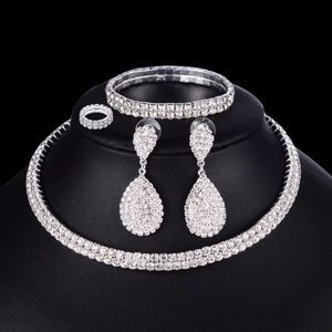 4 PCS Luxury Wedding Bridal Jewelry Sets for Brides Women Necklace Bracelet Ring Earring Set Elastic Rope Silver Crystal Jewelry