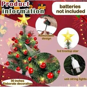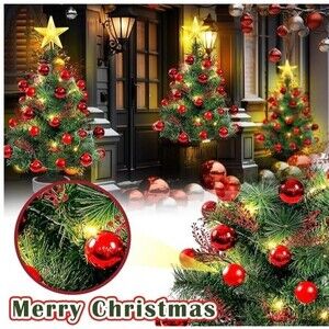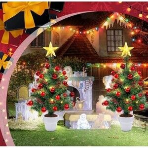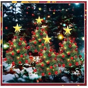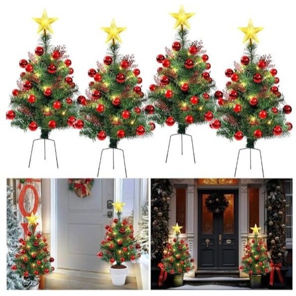 2024 Christmas Holiday Planter Filler for Outdoor Front Porch: increase the beauty and light up your home with these 4 pack pre-lit artificial Christmas pathway tree with full tip branches and vibrant green leaves; Includes star lighted Christmas tree topper, 10 cm and 4 cm Christmas balls for added charm; Powered by USB, batteries not included