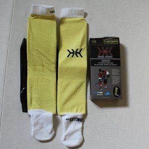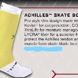 4 pair hogan hockey achillies protective hockey socks. Size to choose from are: adult small (shoe size men 6-8 women 7-9), adult medium (shoe size men 8-1/2 - 10-1/2 women 9-1/2 - 11-1/2), and adult large (shoe size men 11-13). Materials are 60% aramid, 30% polyester, and 10% spandex. This is new in package(package may have wear- torn/creased box)