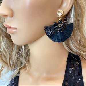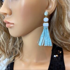 (1) pair of blue paper tassel and rhinestone dangle earrings.